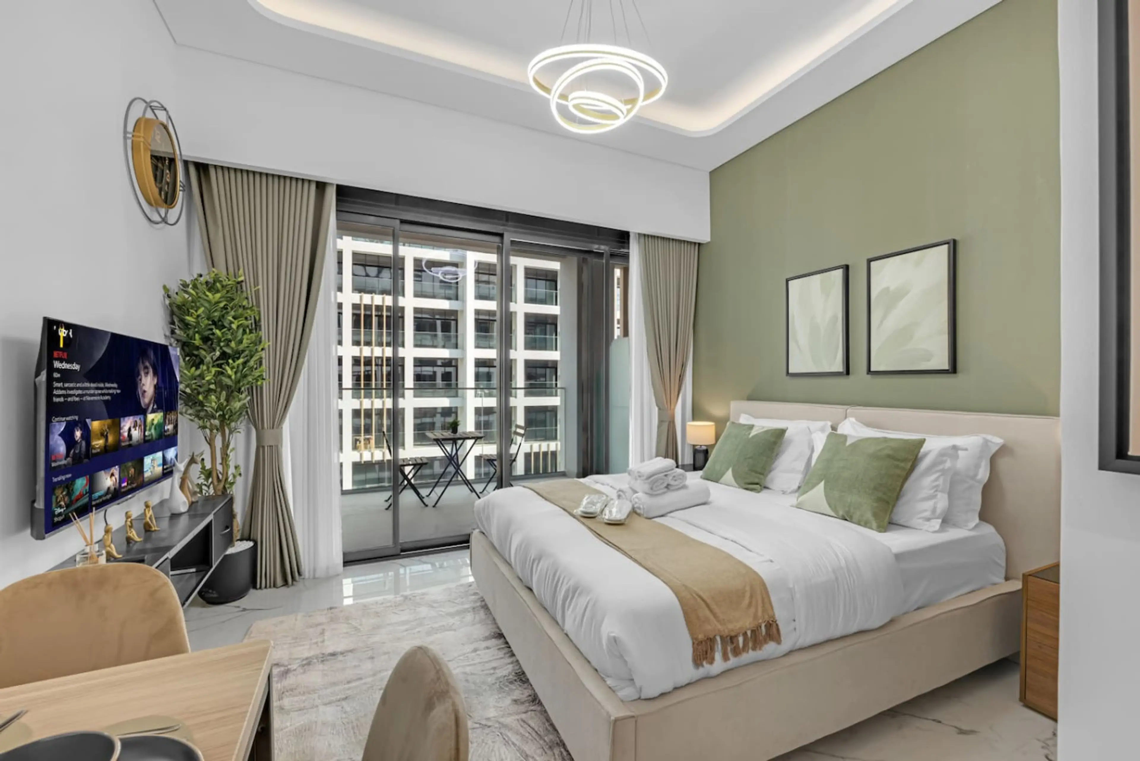This stylish studio offers a sophisticated home away from home in Dubai. The open-plan layout features a comfortable bed, a designer kitchenette, and a spa-inspired bathroom with luxury amenities. Bright natural light fills the space, highlighting its contemporary elegance Perfectly situated in a v...